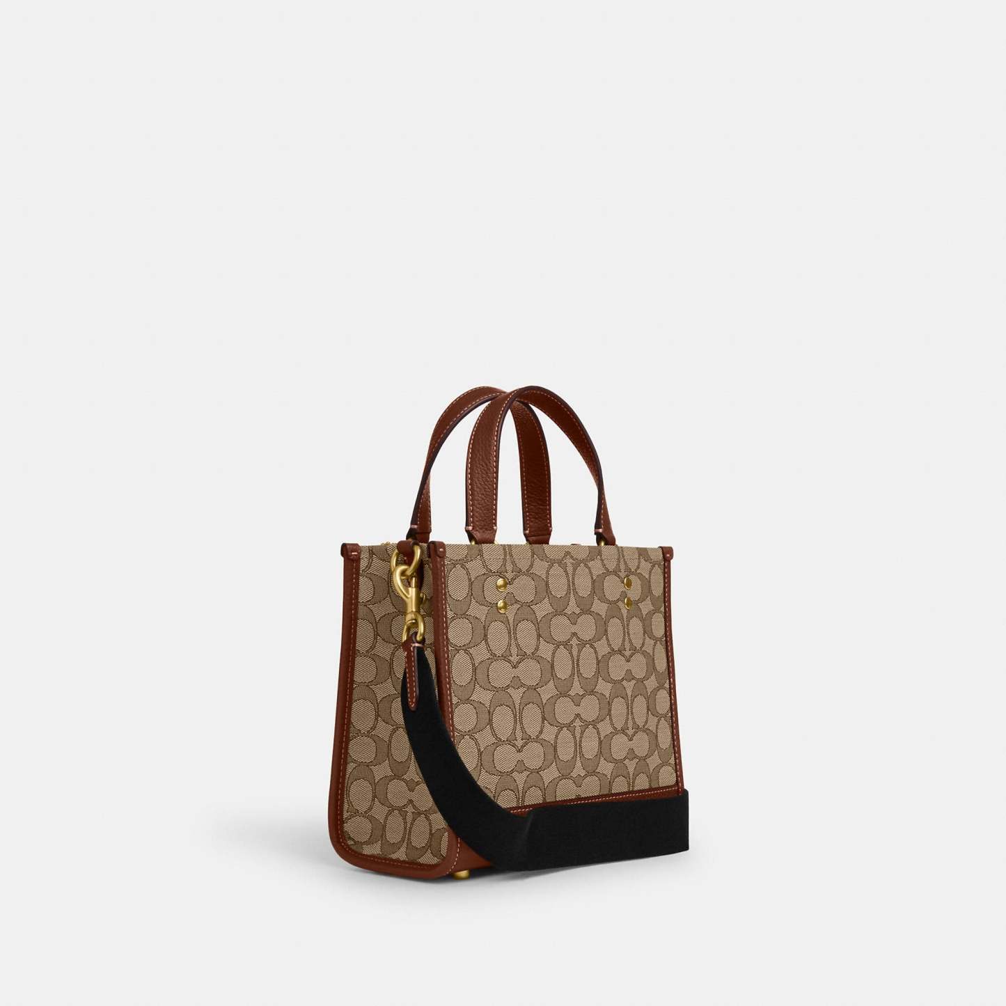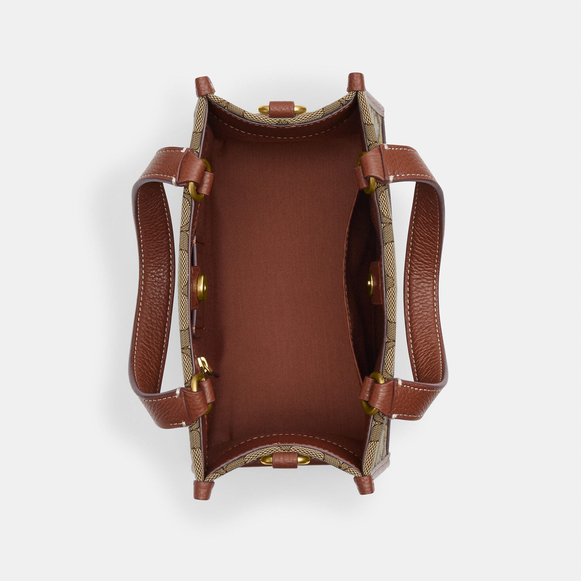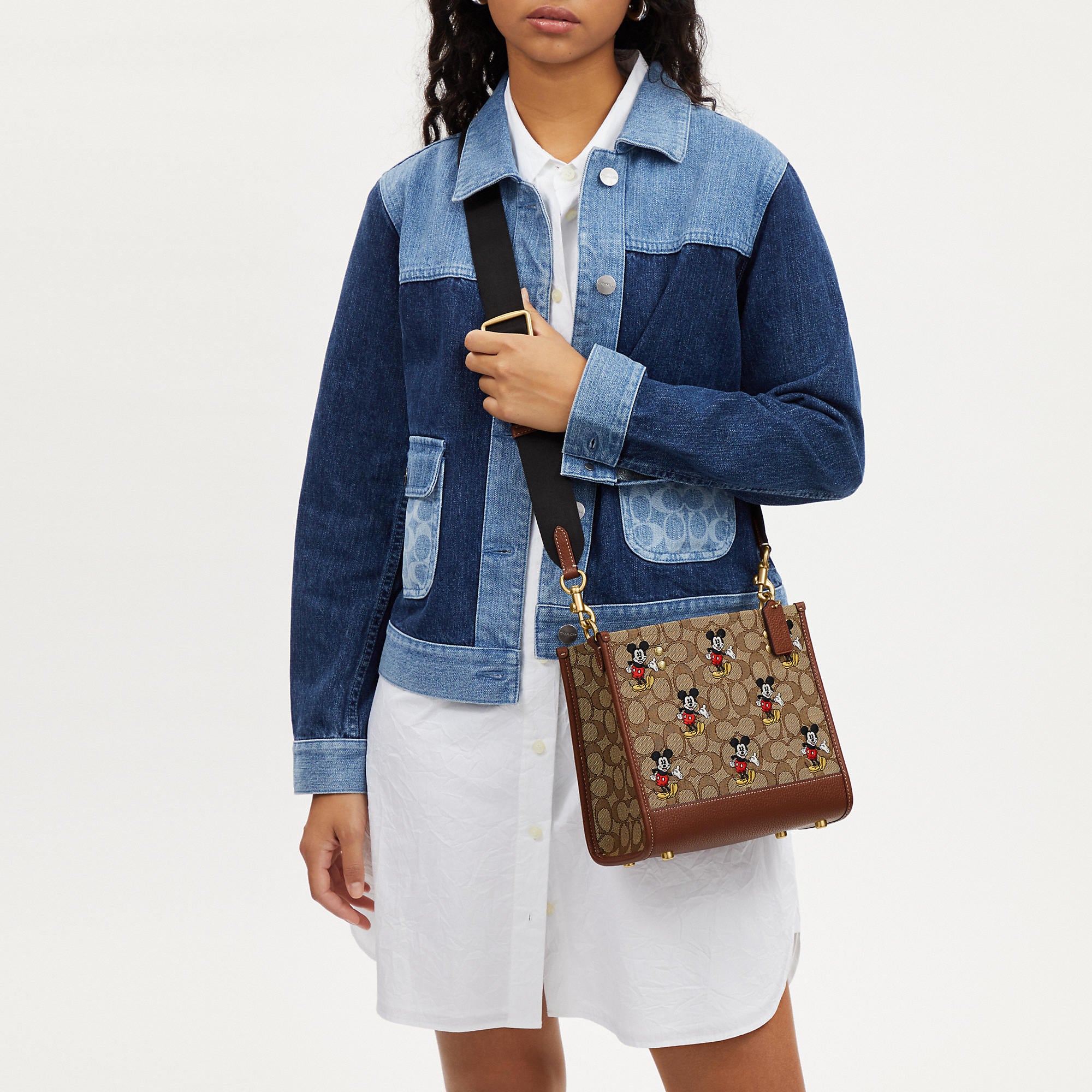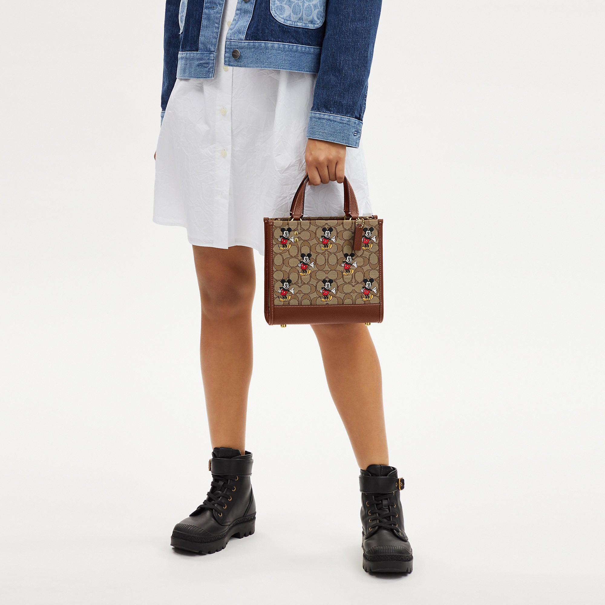 Signature jacquard and refined pebble leather Inside zip and multifunction pockets Snap closure fabric lining Handles with 4 1/4 drop Detachable strap with 22 1/2 drop for shoulder or crossbody wear Four protective feet at base 8 3/4 (L) x 7 3/4 (H) x 4 1/4 (W) This Coach piece is crafted of our Signature jacquard made from a blend of organic cotton and recycled polyester Disney x Coach ©Disney Style No. CM199 | Coach Outlet Disney X Coach Dempsey Tote 22 In Signature Jacquard With Mickey Mouse Print - Multi