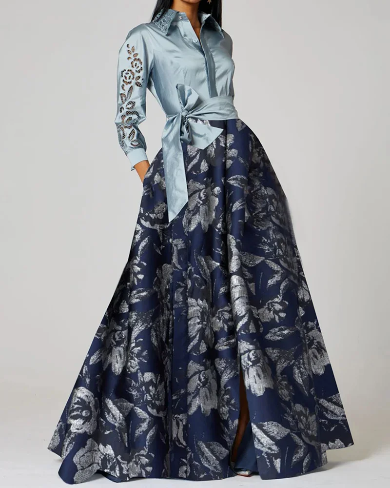 Contrast printed brocade shirt collar maxi dress