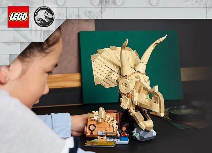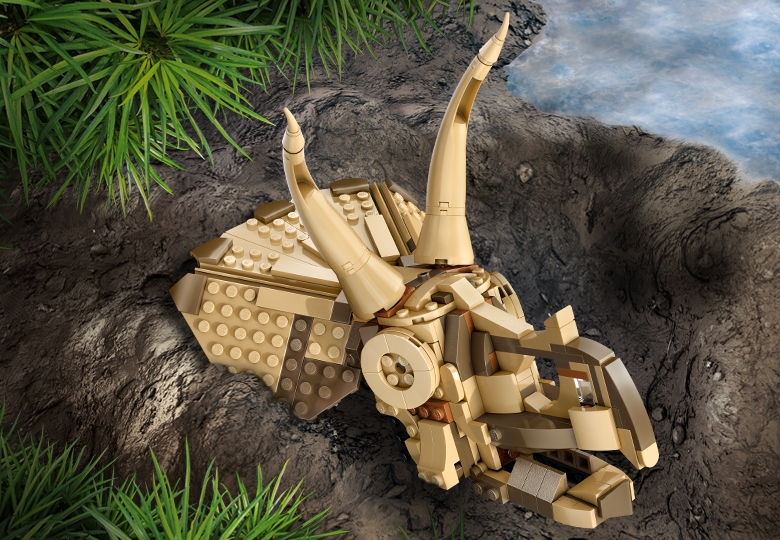 - Dinosaur building kit – Has a Triceratops skull with a stand, informational plaque, dig site plate with mini-fossils and excavating tools, Junior Paleontologist LEGO® minifigure and an ’amber’ piece
