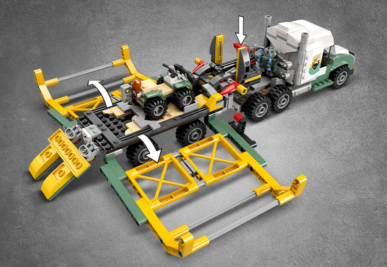 - Adventure playset – Vehicle-loving kids will enjoy this Jurassic World adventure toy, with a semi-truck that has a LEGO® dinosaur cage trailer with lowering ramp and walls, a quad bike and more