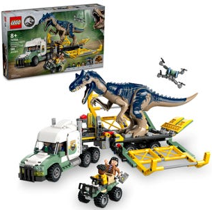 Fun LEGO® Jurassic World set includes a semi-truck with dinosaur cage, a molded Allosaurus figure, 4 minifigures and more.