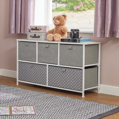 Our grey 5 drawer storage chest is a stylish and attractive design which will fit into small spaces but still provide ample storage space. In addition, the wooden top with rounded edges for safety can be used to place pictures, books, lamps, toys, and anything else you might want to display. Ideal and attractive storage solution for nurseries, bedrooms, or playrooms.