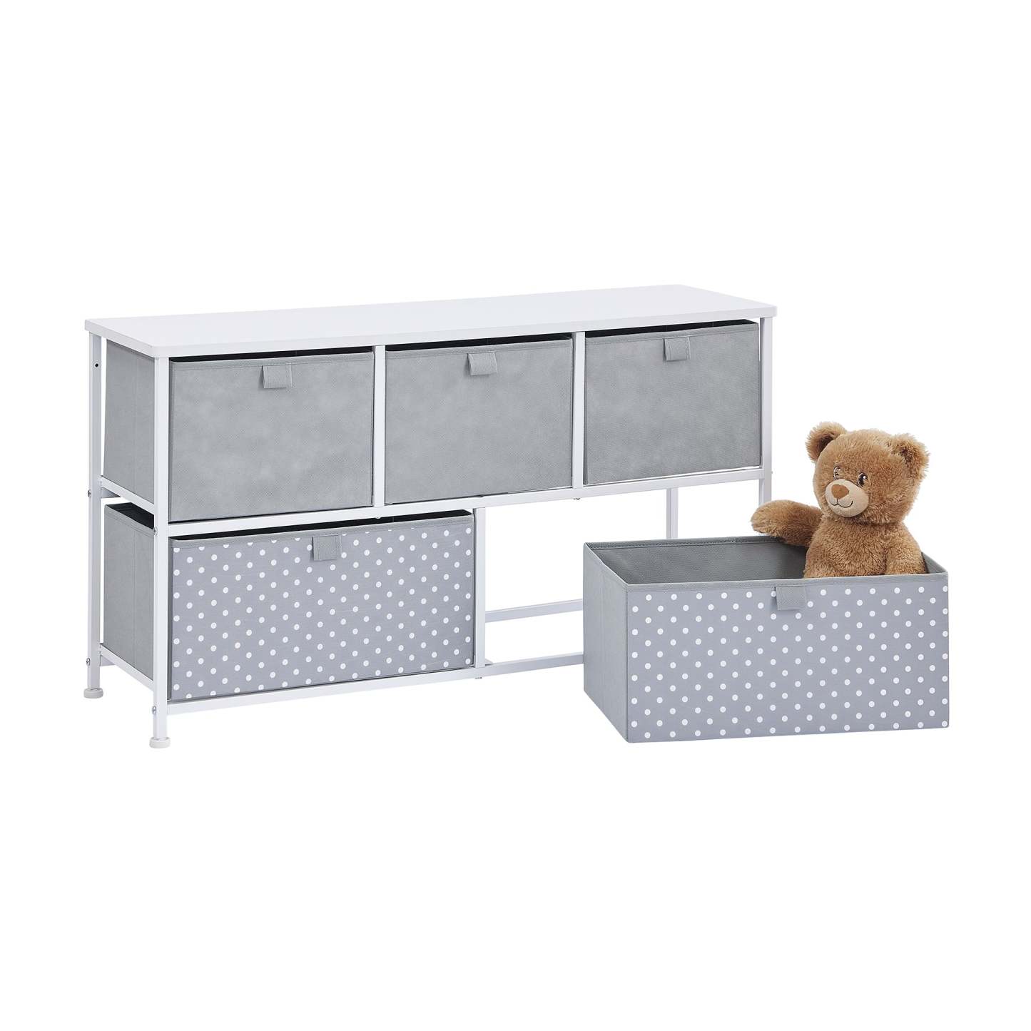 The removeable drawers are in 2 sizes – both offering generous storage capacity. A firm extra board base is supplied for the bottom of each drawer – providing extra strength and stability. Drawers are a supplied in grey colour and 2 polka dot designs. Drawers simply slide into place and each shelf has a back stop to prevent drawers sliding out.