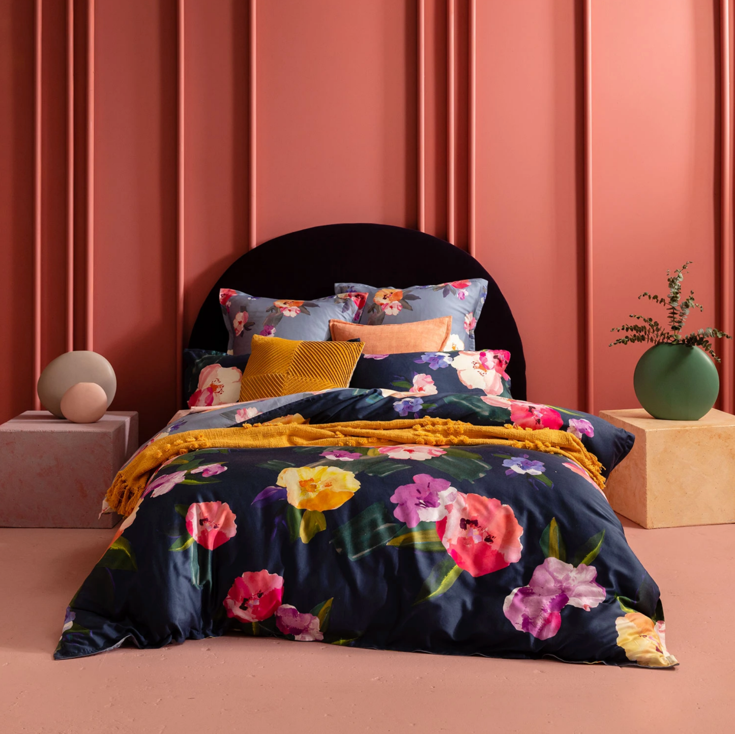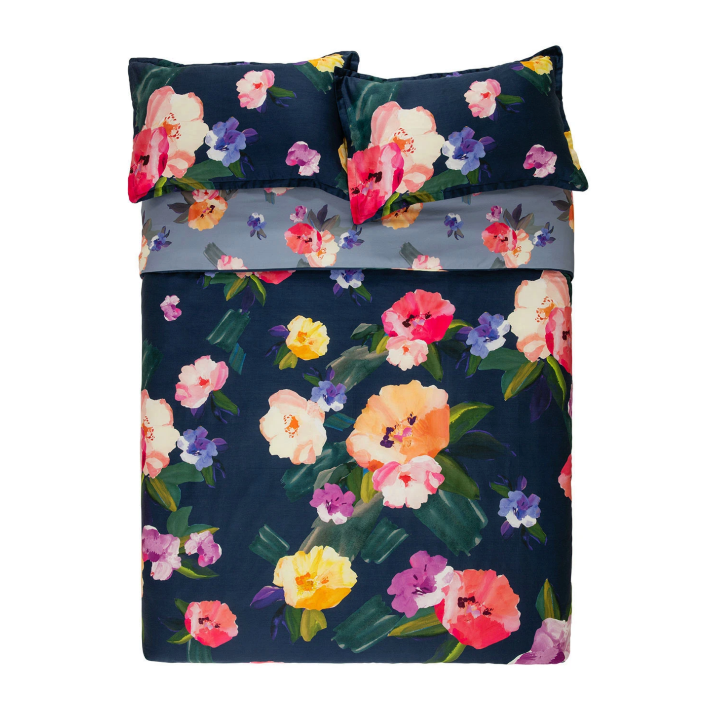 Printed on a shimmery navy cotton sateen, sweeping brushstrokes in rich tones of pink, yellow and purple create a floral masterpiece.