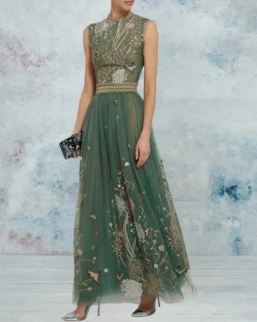 Nature Embroidered Mesh Dress Gown