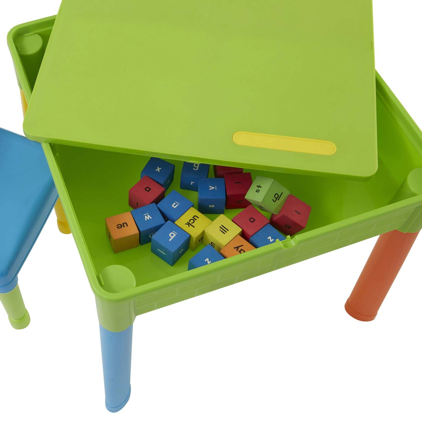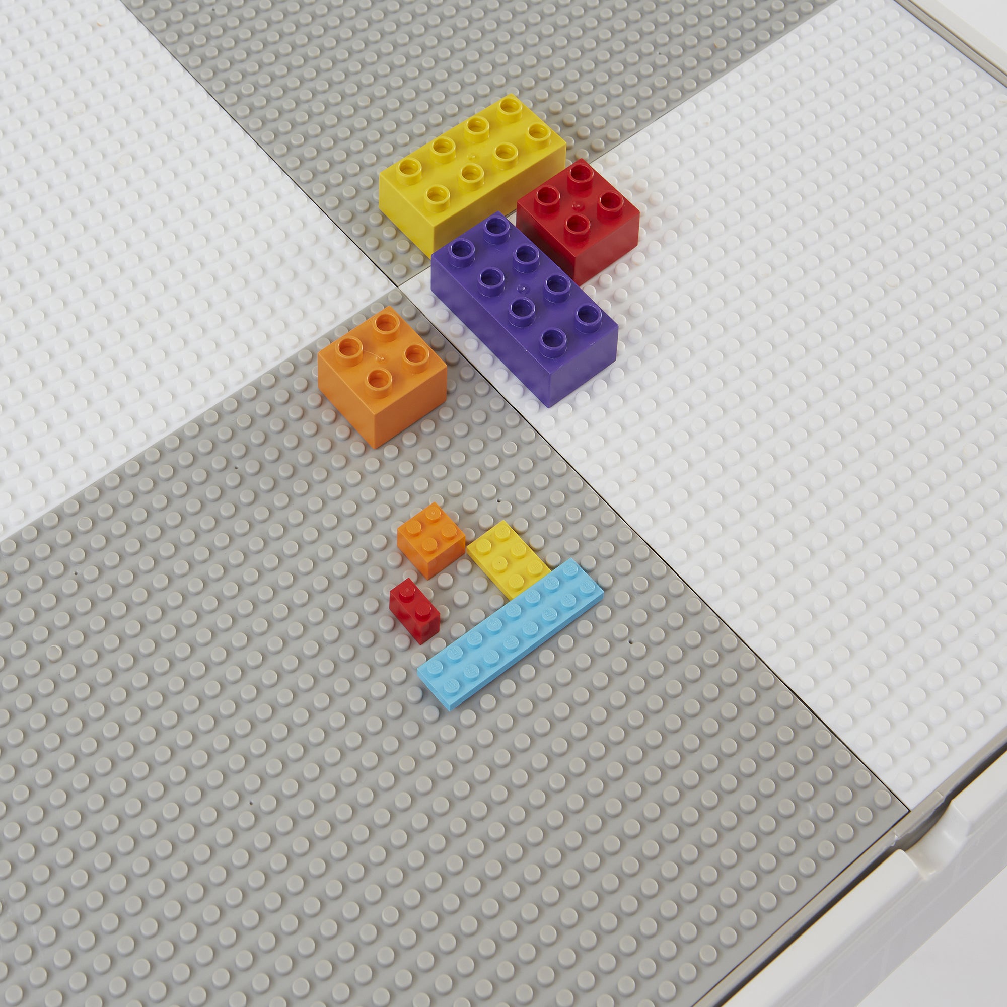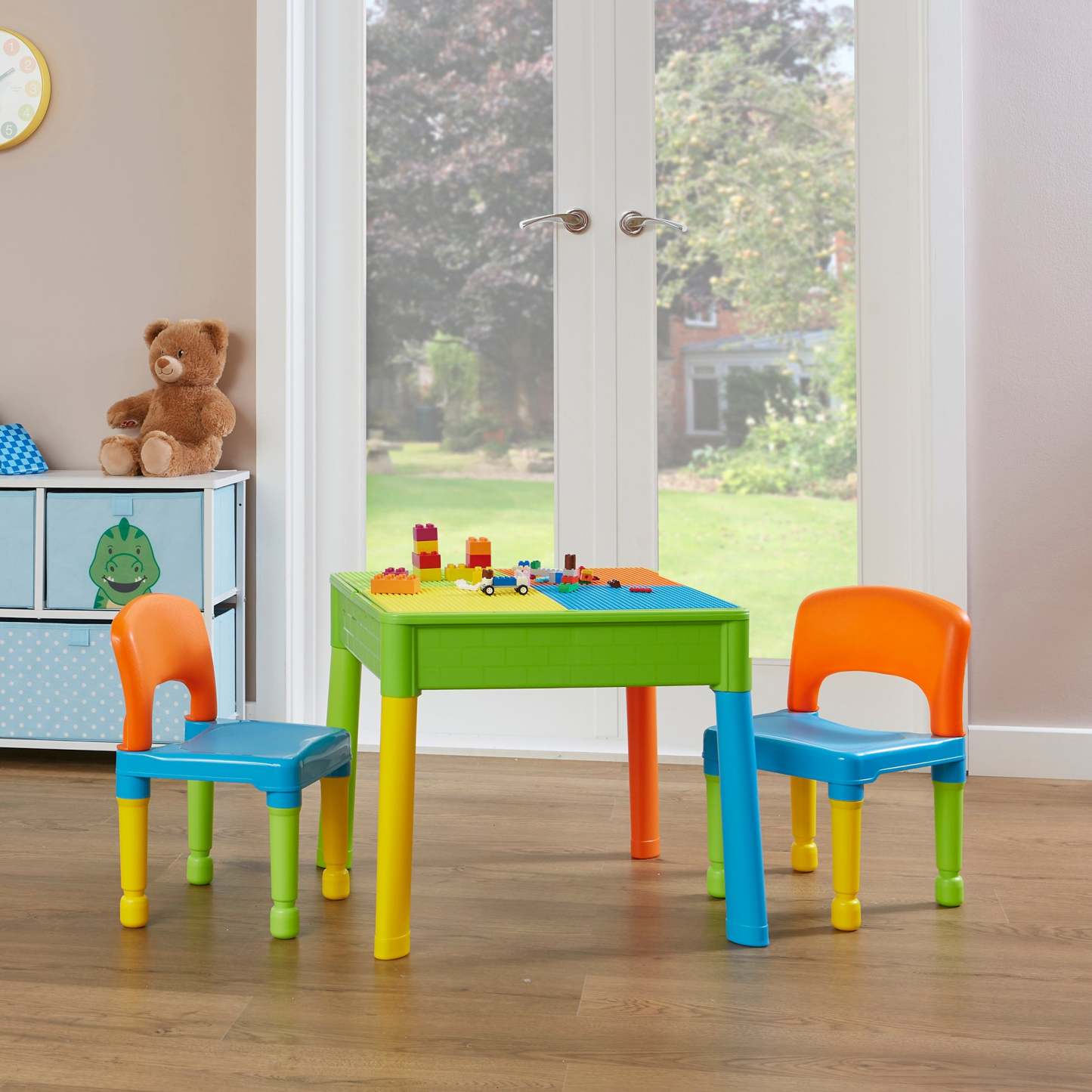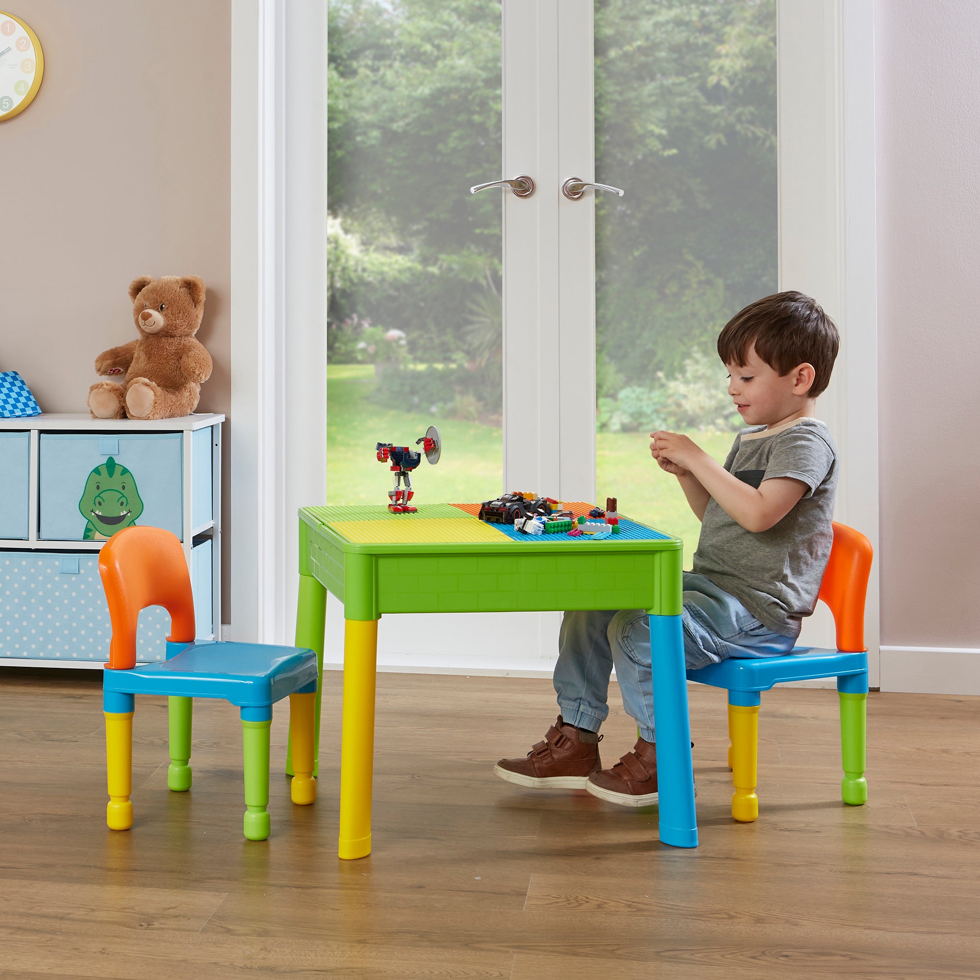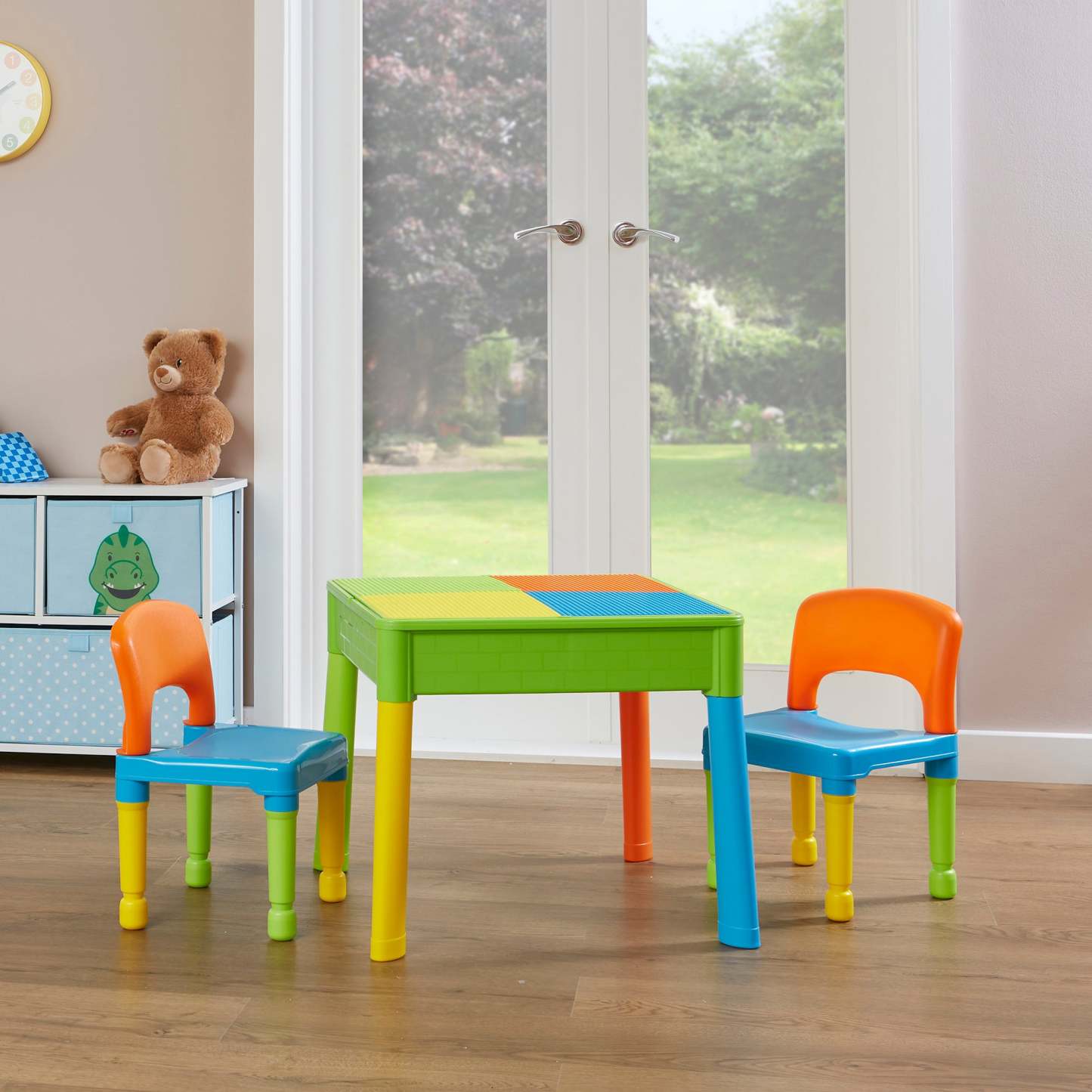 Our square activity table set has a reversible tabletop, one side is smooth, which is excellent for your child to eat, play, write, and do homework. Flip the tabletop over to reveal a construction tabletop ideal for little ones who love to build and create. All our construction tabletops are compatible with the leading brick brands so your child can get the most out of this square activity table.