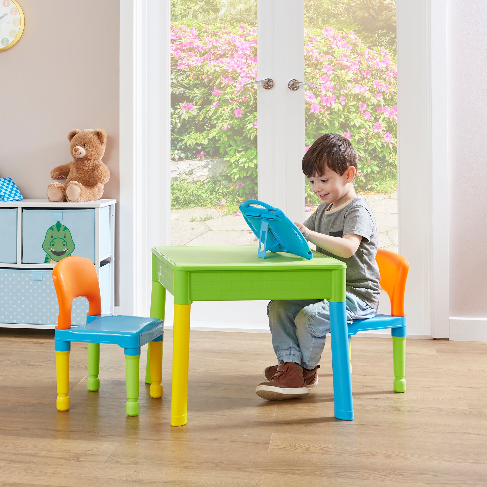Take a look at our unique 5-in-1 multipurpose square activity play table and chair set. If you don’t have a lot of space but are looking for a piece of children’s furniture that will provide hours of fun, this set is ideal. It will save on space and gives your child endless options for playtime. Even better the set is suitable for both indoor and outdoor use. Set includes 2 chairs.